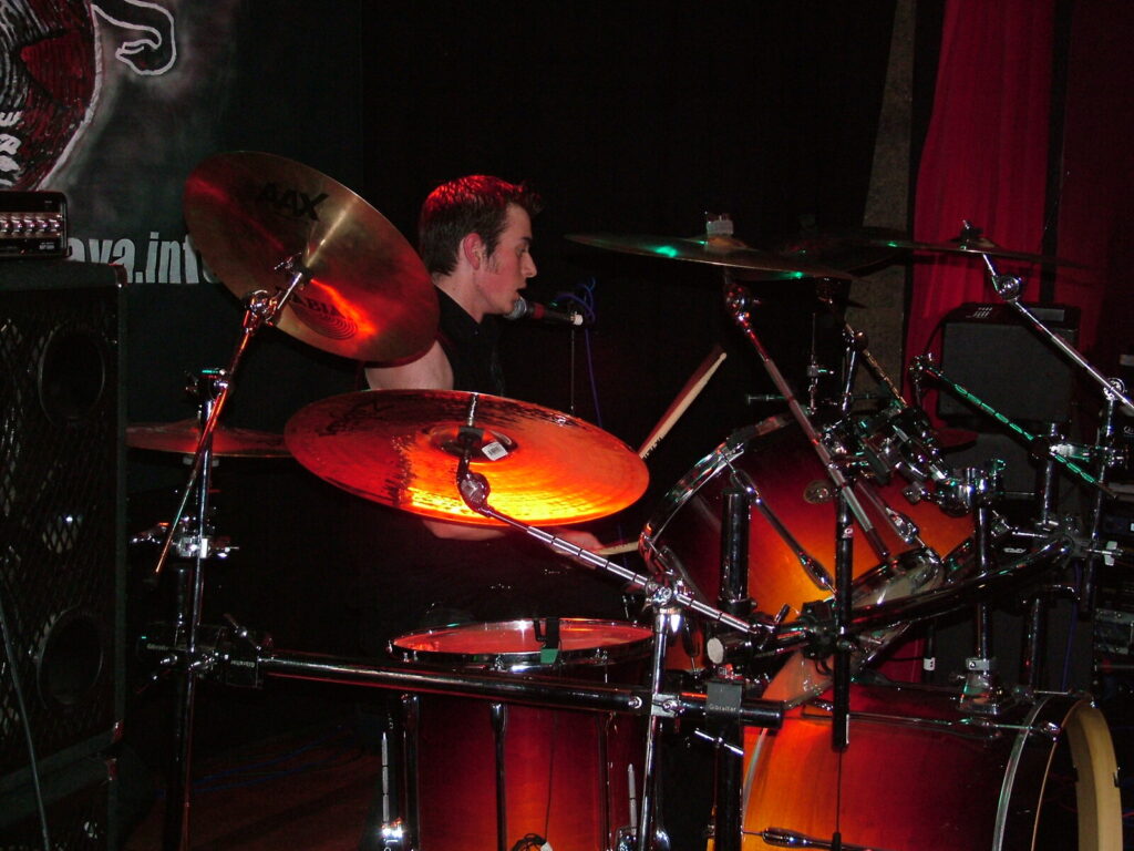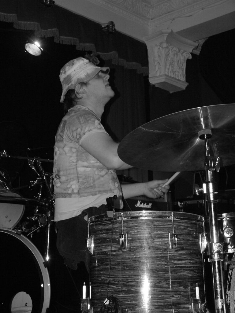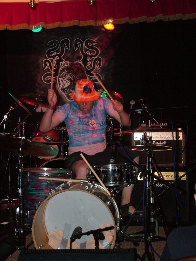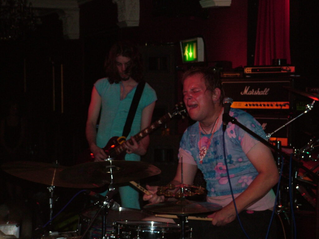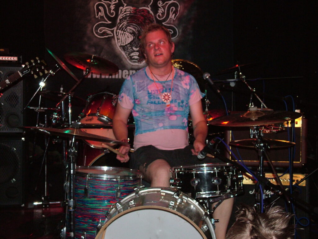 smashing his bass drum off the stage and wandering round the crowd in a daze, hitting his snare until he breaks both sticks.