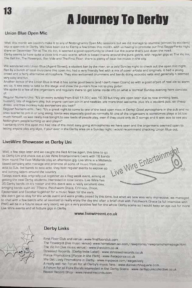 Saggy-Pants Magazine Issue 3 (Dec 2005) is a Christmas-season snapshot of Nottingham’s DIY rock, punk and metal circuit, centred on Junktion 7 and key local rooms like The Old Angel, Rescue Rooms, and the Boat Club. It features interviews and reviews with Yes My Ninjas? and Trippin Over Wah, gig write-ups from Junktion 7, and demo or CD reviews covering bands such as Sweetbriar, Winning By Default, and Cerebral Vacation. The back half becomes a practical guide with a dense December gig guide and flyers for bills including Weeble, Hinterland, Mr Wolf, Dead Souls, and a Varukers-headed punk Christmas show. One page has a scan issue, so the included extra scan adds a Derby scene report and venue links.