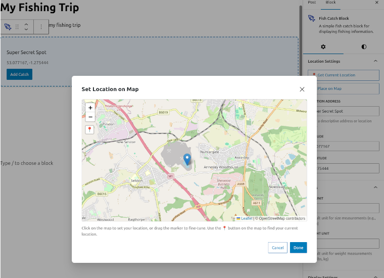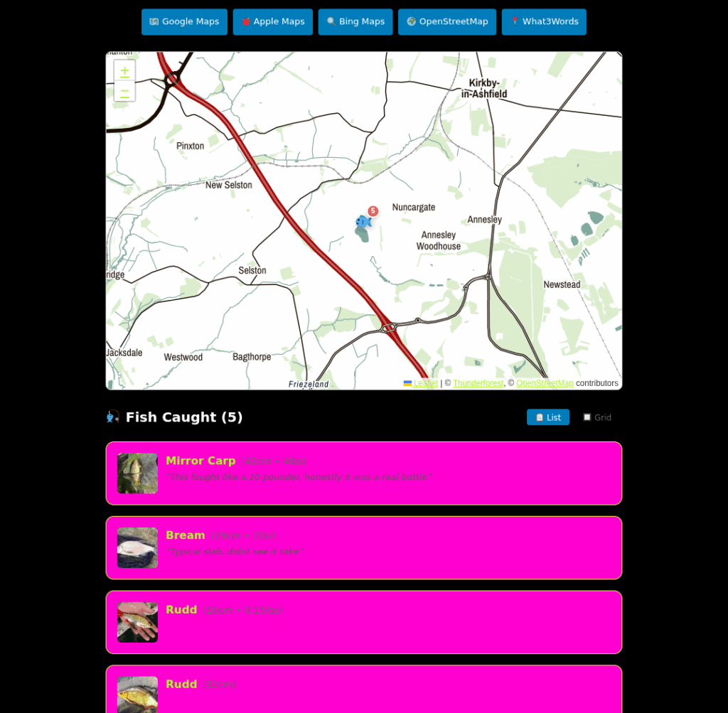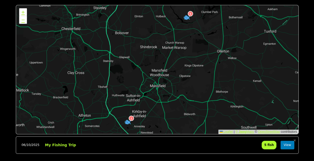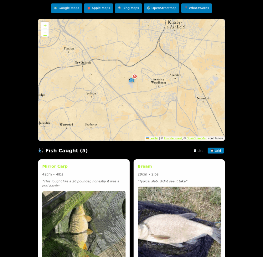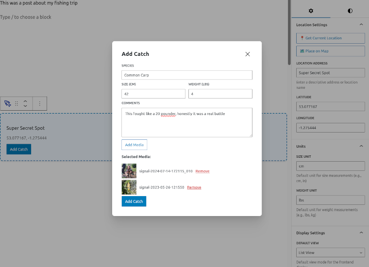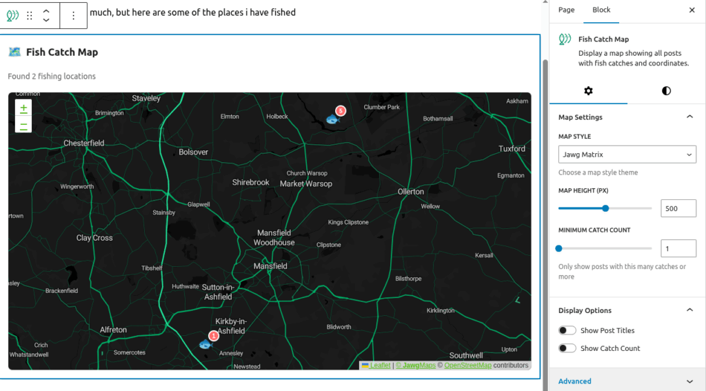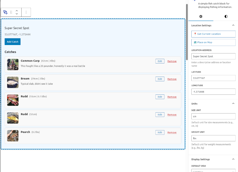 A WordPress plugin that adds 2 blocks to any WordPress site. One is a single block, that can be used to log all catches from a single session. You can show a map of the location, with a pin to show the exact location you fished (or general area if stalking) and list all fish you cactch. The other block, acts as a summary block, which will include all catches. These are shown as a simple pin with a count of the fish caught, linking back to the initial post.