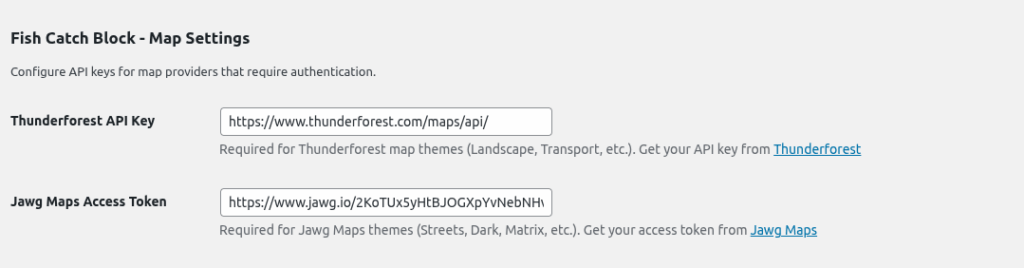 Once you have the plugin installed, you can setup the API needed if you want to use the other templates. Thunderforest and Jawg API keys can be added to the usual WordPress General Settings page.